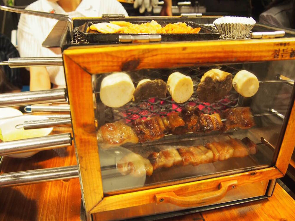 店內以這個自助燒烤箱聞名,多種串燒如韓牛、五花腩、鴨肉、甜蕃薯、大蝦等等放進烤箱內便可烤熟,烤好後上面的版可保持食物熱度,其實就是一個傳統韓燒不過變了箱子狀