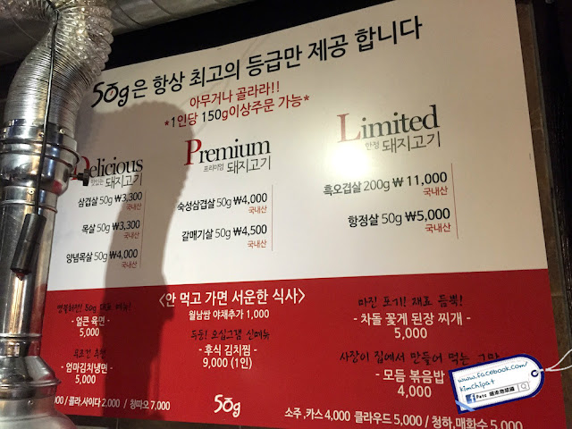 店名為 50G,因店家主打烤肉,有三層肉 / 五層肉 / 豬頸肉 / 豬排肉等等,每50G起點,讓大家可以試哂不同部位,價錢也是3300 - 5000krw (約HKD20-30)不等,十分抵食。