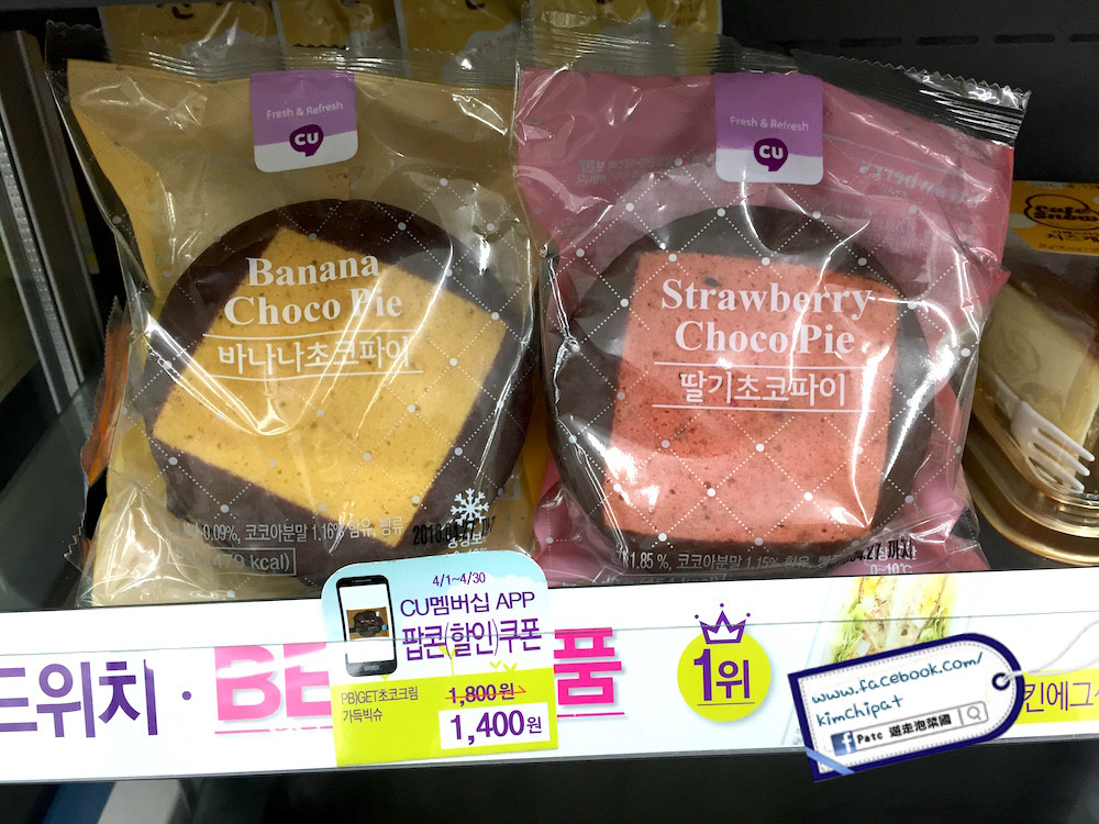 韓國這款四邊沾滿朱古力醬的 Choco Pie 最先由全州開始流行,中間夾著鮮忌廉及果醬,在全韓國火紅後不同品牌也繼而推出不同味道如草莓 / 香蕉朱古力批。本人認為草莓較香蕉好吃,雪凍後口感更佳。