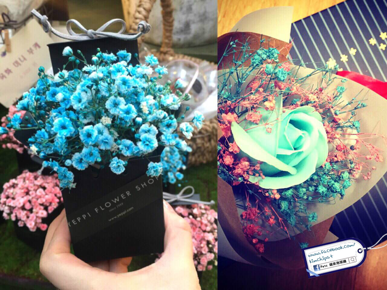 大熱顏色 Tiffany Blue x Baby Pink,保鮮花全人手制作,售價約 8000krw - 15000krw (HKD50 - HKD110),視乎大小及複雜程度,有盒子保鮮花和保鮮花束,雖然香味不大,但作擺設或送禮也是最佳選擇,保證收花人一定喜歡。