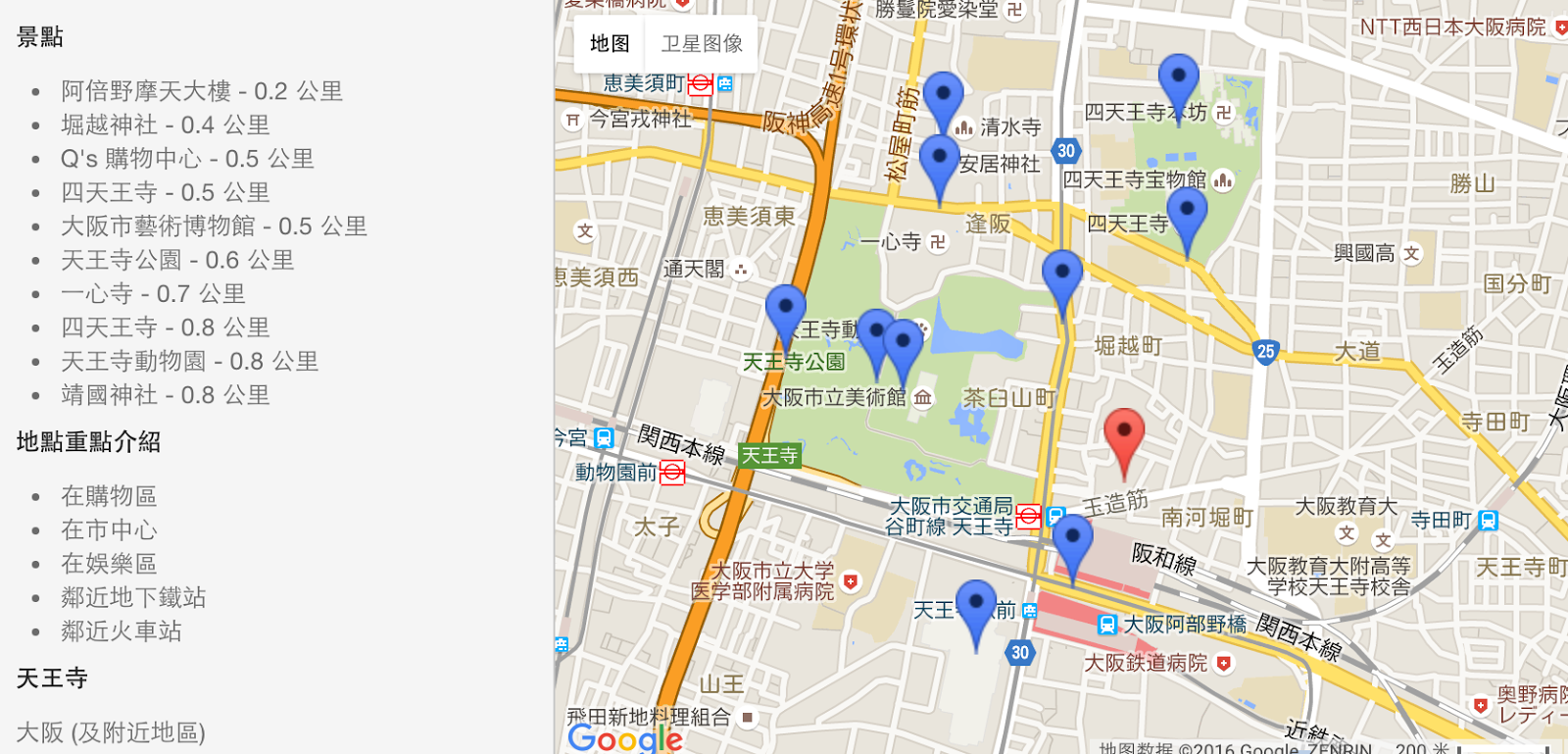 酒店週邊也有阿倍野摩天大樓、堀越神社、四天王寺、大阪市藝術博物館、天王寺動物園、靖國神社等等的景點,天王寺也是大站,去心齋橋 / 梅田也不用轉線,很方便。
